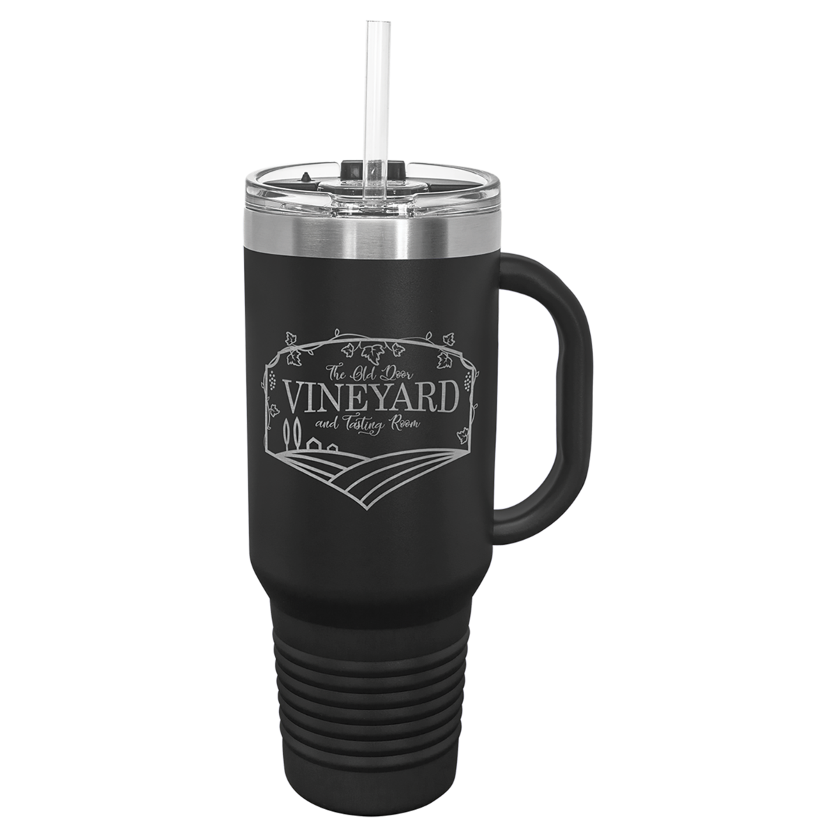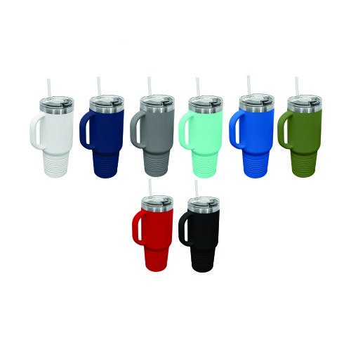 The 40 Ounce Travel Mug is designed for convenience, ultimate hydration, and durability. The bottom of the cup was specially made to fit into cup holders, and the thick handle was designed for easy gripping.